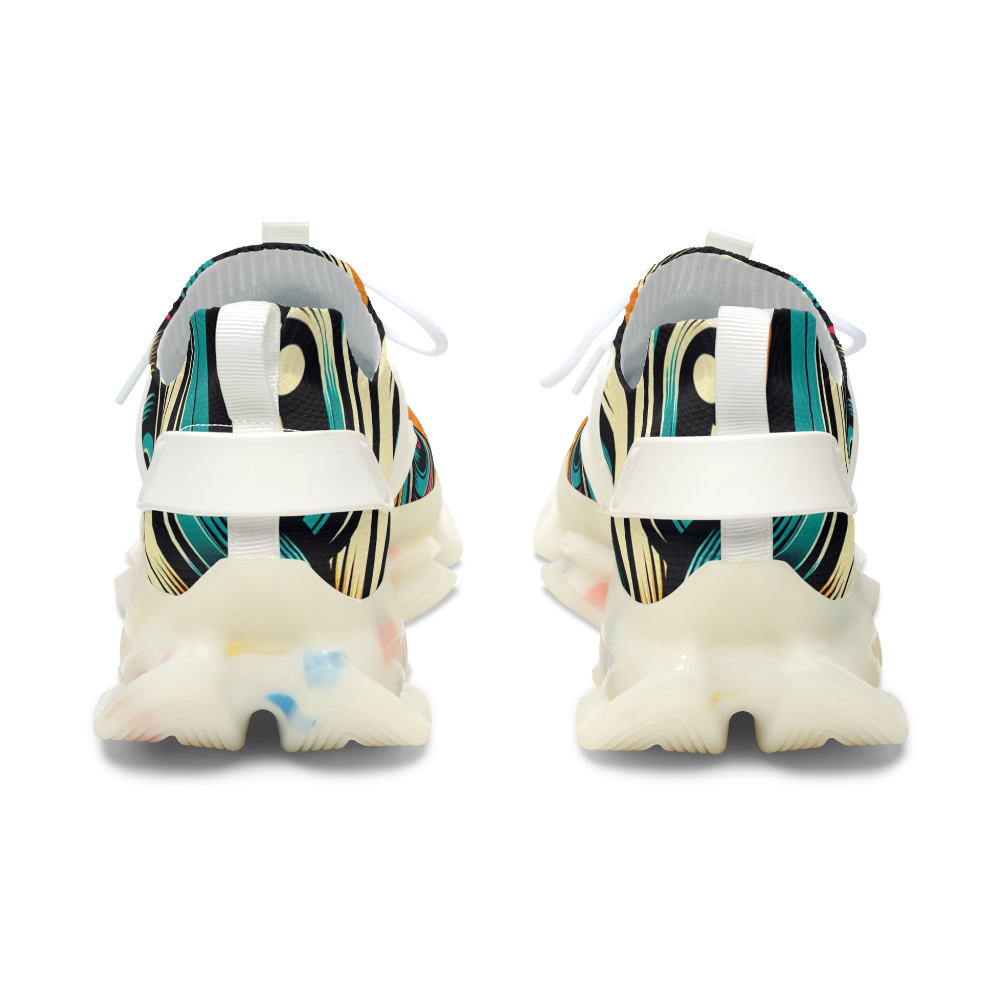 Colorful sneakers with abstract patterns worn on a blurred street background