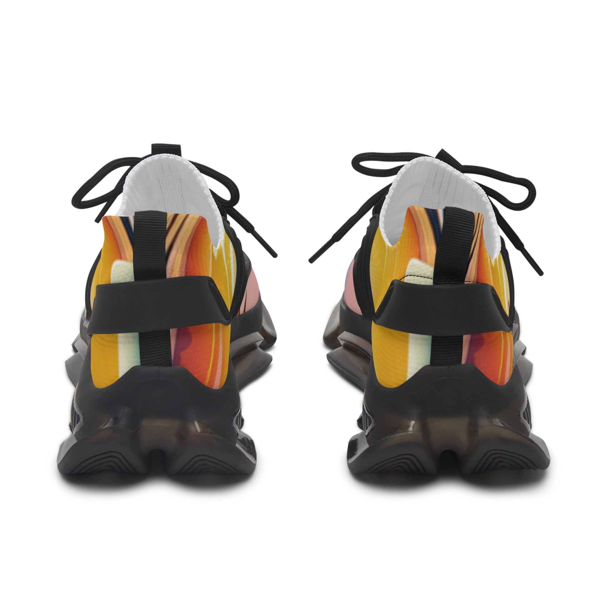 Colorful sneakers with a gradient design worn by a person in white pants.